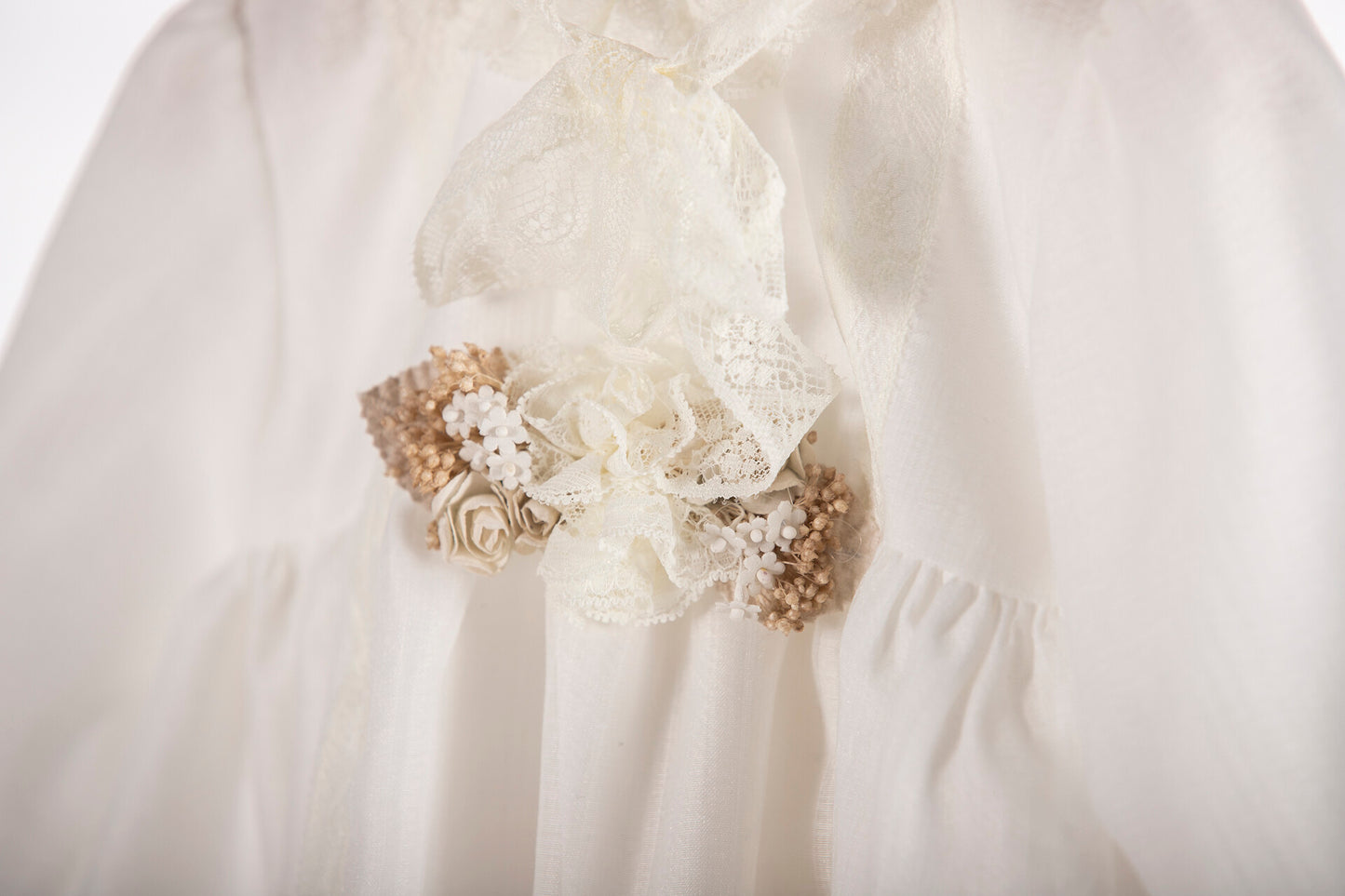 Precioso vestido con cubrepañal y capota en color crudo de la marca española Niseret. Confeccionado en organza muy suave, presenta preciosas aplicaciones de encaje en cuello, puños, bajo y laterales, y flores en el pecho en tonos crudo y beige. Se abrocha en la espalda con botones para facilitar su colocación. El cubrepañal tiene una cinturilla elástica que se adapta a cualquier cintura. La capota también tiene encaje a juego con el vestido. ¡Un estilo perfecto para ocasiones especiales!