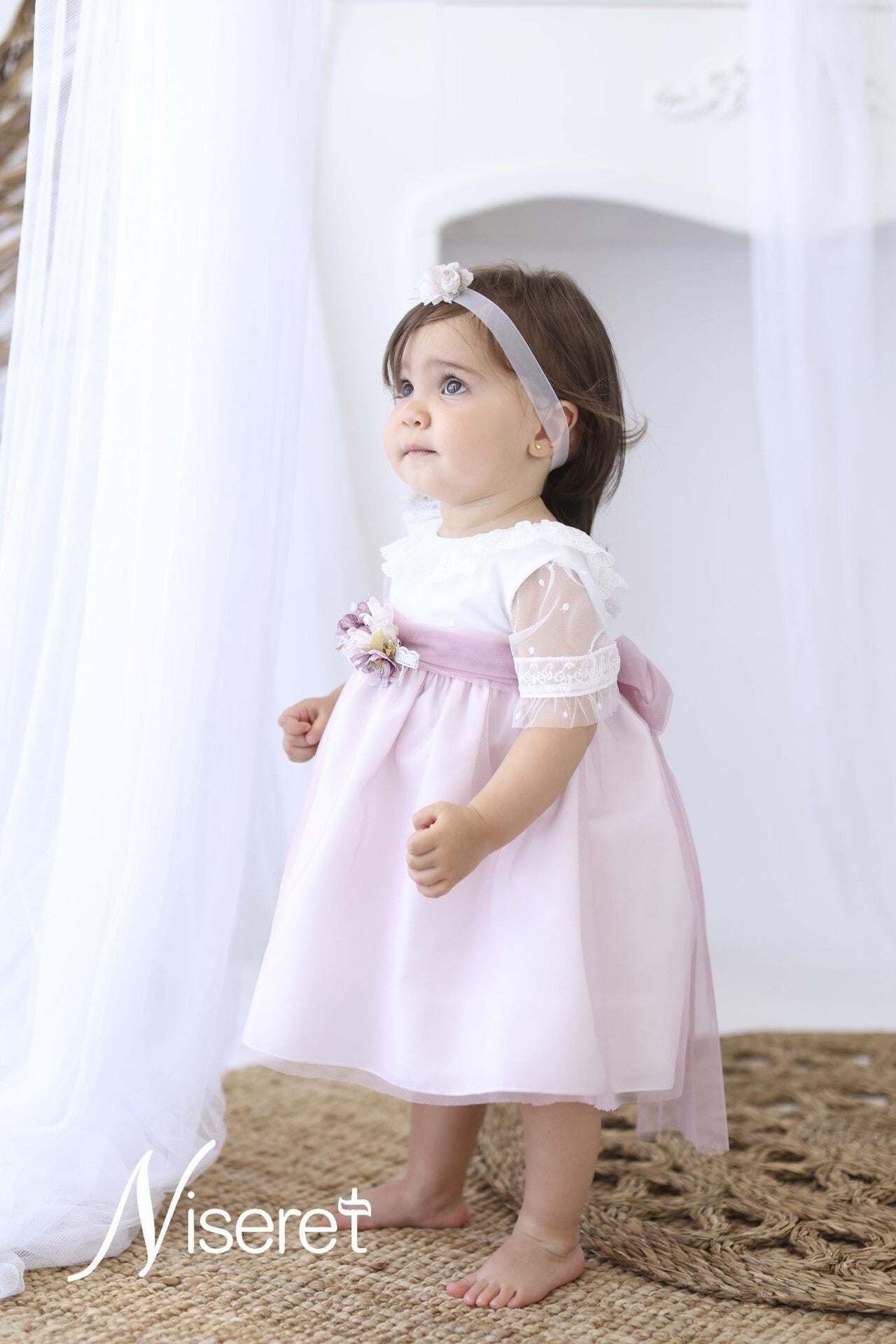 Vestido de tul bordado de la marca española Niseret. Delicado en cada puntada, con tul rosa que lo hace único. Fajín de tul rosa que forma un gran lazo en la espalda. Escote en V en la espalda. Adorno floral no incluido.