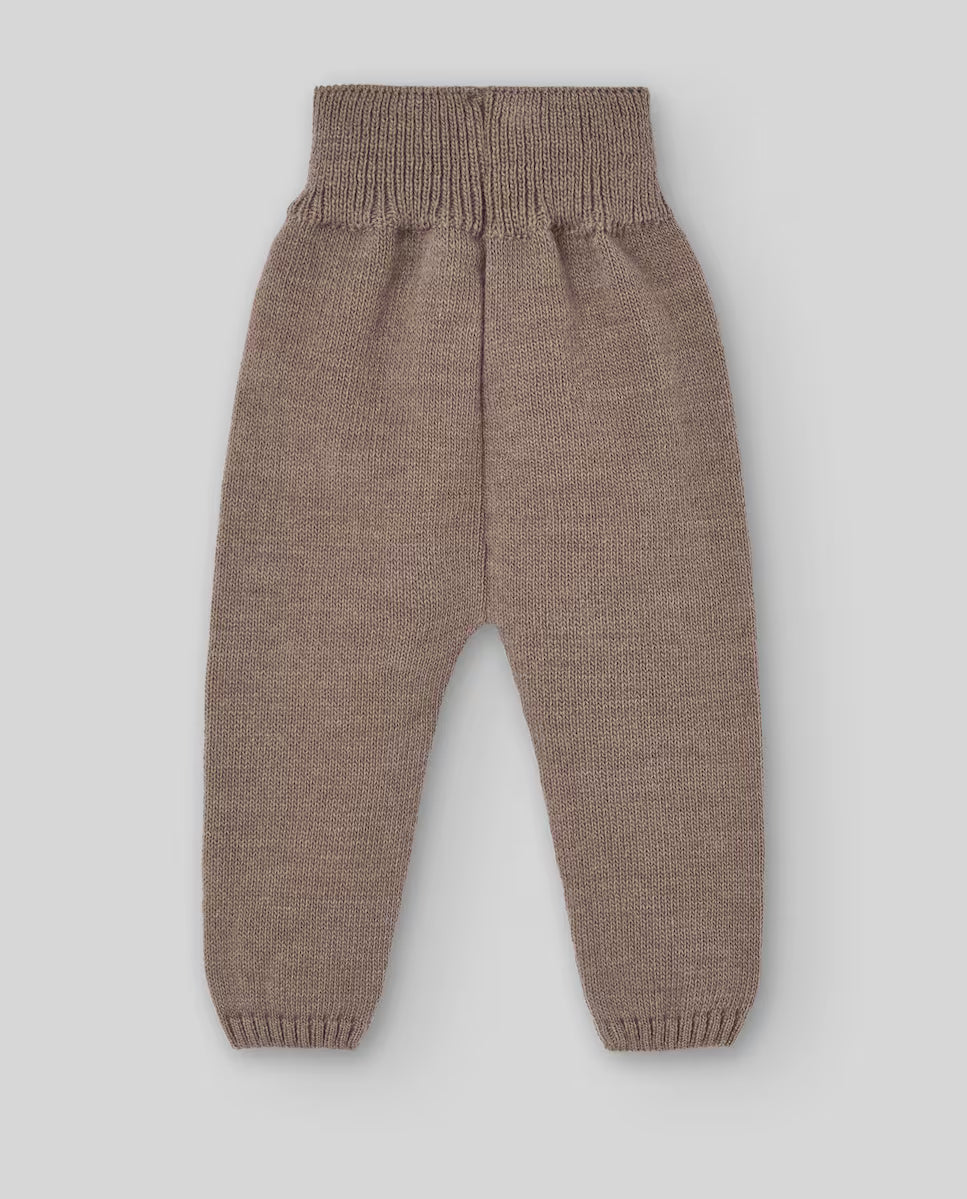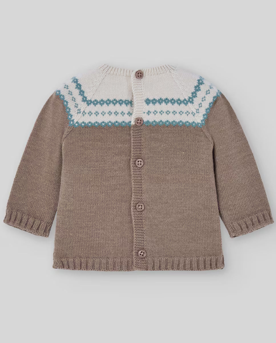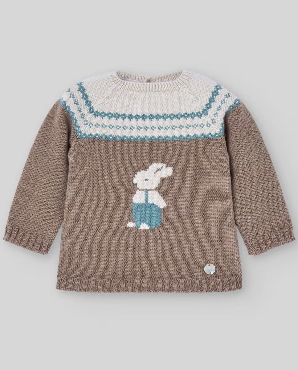 Conjunto de camisola e calça castanho tricotado da Paz Rodriguez. Camisola de manga comprida com design jacquard com um coelho na parte frontal. Gola redonda e parte superior com desenho geométrico em contraste. Aperta com botões nas costas. As calças sem pé de malha lisa. Cintura larga de canelado para maior suporte e conforto , fáceis de vestir.Malha grossa que torna um conjunto ideal para os dias mais frios. Uma peça prática para o dia a dia.