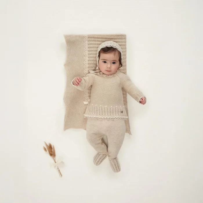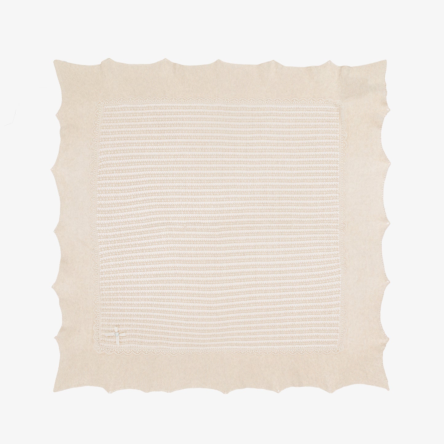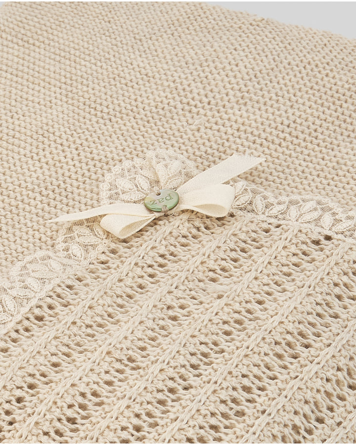 Maravilhosa manta bege para meninos e meninas da marca espanhola Paz Rodríguez . Produzida numa malha fina de algodão macio, com um toque de caxemira, com um bonito padrão vazado. Delicados detalhes em renda e uma borda recortada. Textura macia que a torna ideal para manter os pequenos aquecidos e aconchegados.
