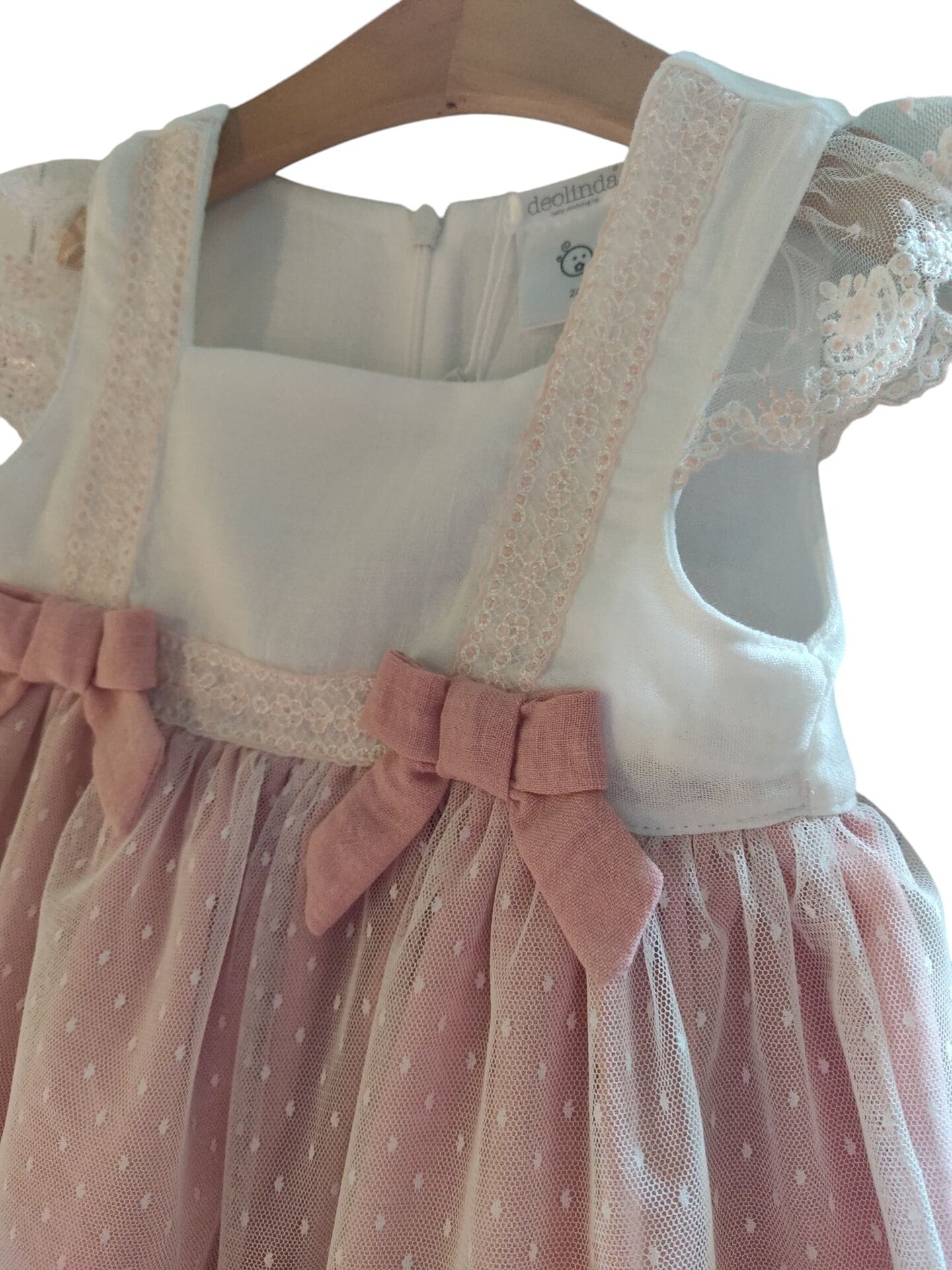 Vestido cerimónia rosa velho e crú em linho e tule da Deolinda